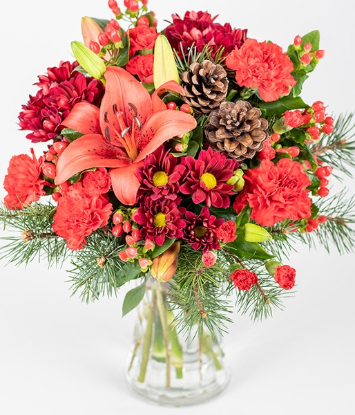 A traditional festive bouquet, bursting with red carnations, red lilies, chrysanthemum, pinecones, and fragrant seasonal foliage.
