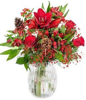 Bring the charm and warmth of Christmas into your loved one's home with our Festive Pines & Petals bouquet. Featuring radiant red roses, alstroemeria, hypericum, vibrant amaryllis, and touches of seasonal greenery. This enchanting yet affordable bouquet fills any room with holiday cheer. Lovingly prepared by a local florist and hand-delivered to your loved ones' door.