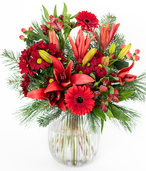 A bouquet that embodies this magical season. Our Merry Christmas florist bouquet includes red chrysanthemums, lilies, alstroemeria, germini, and hypericum berries alongside seasonal foliage. Lovingly hand-crafted for your loved one this Christmas and delivered straight to their door by a local florist. Make this Christmas magical with blooms to suit every budget.