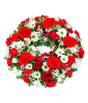 A red and white wreath, arranged by your local florist. Containing red carnations, white lisianthus, red spray carnations, white chrysanthemums, red alstroemeria and gypsophila.